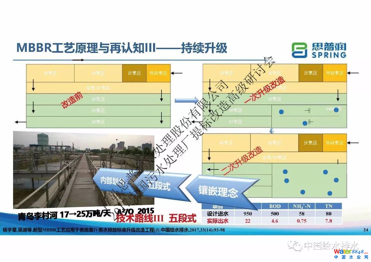 我們的填料的處理能力和表面負(fù)荷、比表面積和填充率相關(guān)。當(dāng)我們將一代填料按照45%的填充率填充時(shí),MBBR達(dá)到跟傳統(tǒng)活性污泥法基本相當(dāng)?shù)南趸芰。如果我們采用更大比表面積填料、更大填充率,它的負(fù)荷將有更大提升,這就使得我們工藝新建的時(shí)候能夠節(jié)約占地,在改造的時(shí)候可以在很大范圍內(nèi)實(shí)現(xiàn)提標(biāo)。青島李村河就是這樣一個(gè)工程案例,2010年進(jìn)行第一次提標(biāo)改造時(shí),增加了MBBR區(qū)域;2015年由于需要提量進(jìn)行了第二次升級(jí)改造,原有的基礎(chǔ)之上重新劃分內(nèi)部功能區(qū)增加后置反硝化,形成五段式結(jié)構(gòu),再就是擴(kuò)大MBBR區(qū)域,增加懸浮脫氮數(shù)量,實(shí)現(xiàn)平滑升級(jí),也是凝練出第三個(gè)技術(shù)升級(jí)改造路線,強(qiáng)化總氮處理效果。