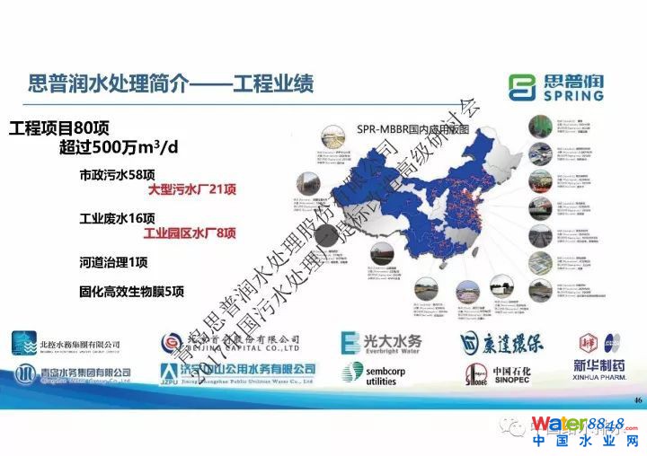 最后介紹一下我們公司,我們是2006年成立,注冊資金6900萬,新三板高新技術(shù)企業(yè)。專注MBBR的建設(shè)。工程業(yè)績現(xiàn)在是近500萬噸每天,思普潤從成立開始跟MBBR結(jié)下不解之緣,專注11年。我們很早時就采用水質(zhì)保障協(xié)議方式保證業(yè)主利益,就是說不達(dá)標(biāo)可以不給我們錢,甚至我們體量達(dá)到三百萬噸時,公司都因為我們的協(xié)議保證而在墊資建設(shè),這也是源于我們對自己工藝的信心。我們擁有完整的自主知識產(chǎn)權(quán),發(fā)明專利,獲取國家省市的眾多獎項。我們李村河獲得水協(xié)張杰院士的審評,參與國家865的專項課題技術(shù)發(fā)展。今天就介紹到這里,謝謝大家。