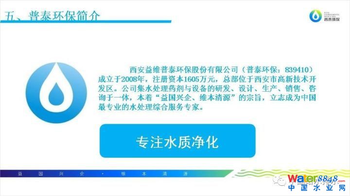 普泰環(huán)保成立于2008年,2016年進(jìn)入新三板。公司產(chǎn)品主要以水處理藥劑為主,分自來水處理藥劑和污水處理藥劑,包括益維磷,益維凈,益維清,益維菌和益維克。其中益維磷和益維凈已經(jīng)拿到了國(guó)家發(fā)明專利。公司營(yíng)銷模式為工程師營(yíng)銷,會(huì)根據(jù)水廠問題以及水廠的水質(zhì)情況進(jìn)行現(xiàn)場(chǎng)考察,制訂個(gè)性化方案解決實(shí)際問題,定期進(jìn)行客戶進(jìn)行回訪服務(wù)。工程師營(yíng)銷是產(chǎn)品+技術(shù)+服務(wù)。