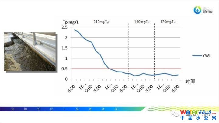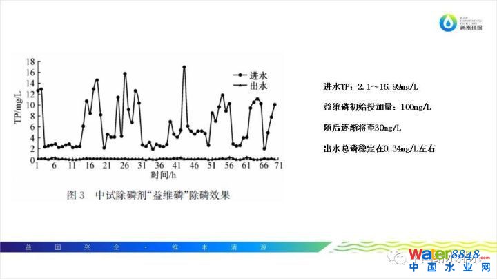 還有在《給水排水》今年第五期發(fā)表文章,是新疆一個(gè)污水廠的除磷案例。進(jìn)水總磷更高,在2mg/L到26mg/L。在總磷高濃度和總磷低濃度下的除磷效果可以看到,益維磷都是比較明顯的。益維磷初始投加量是100mg/L,最后逐漸降至30mg/L,出水總磷依然穩(wěn)定在0.34mg/L左右,出水穩(wěn)定達(dá)標(biāo)。