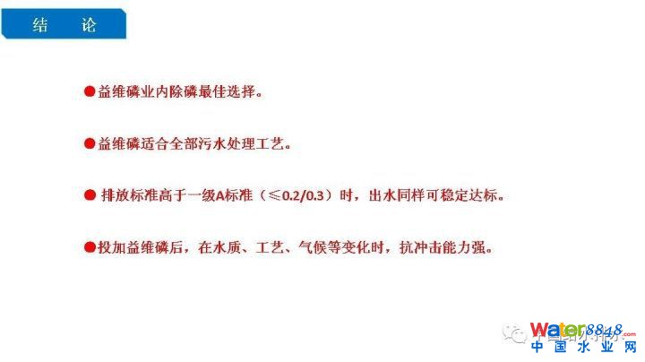 結(jié)論:益維磷是行業(yè)內(nèi)除磷的最佳選擇,而且益維磷適合污水全部處理工藝。排放標(biāo)準(zhǔn)高于一級(jí)A標(biāo)準(zhǔn)時(shí),出水同樣可以穩(wěn)定達(dá)標(biāo)。投加益維磷后,在水質(zhì)、氣候、工藝等發(fā)生變化時(shí),抗沖擊能力比較強(qiáng)。