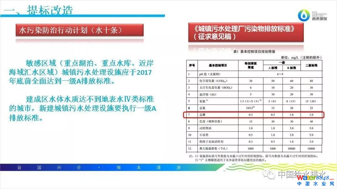 我今天分享的題目是《新型高效除磷劑在城市污水化學(xué)除磷的應(yīng)用研究》。今天的課題分四部分:提標(biāo)改造、益維磷、案例分析、普泰環(huán)保簡(jiǎn)介。今天會(huì)議主題內(nèi)容是提標(biāo)改造,下面我先簡(jiǎn)單說一下提標(biāo)改造。我相信在座有很多污水廠朋友們,我們現(xiàn)在所說提標(biāo)改造,對(duì)于大部分污水廠是指一級(jí)A標(biāo)準(zhǔn),即GB18918-2002。2015年國(guó)家對(duì)此標(biāo)準(zhǔn)發(fā)布了征求意見稿,其中征求意見稿對(duì)各個(gè)排放指標(biāo)都有相應(yīng)提高。