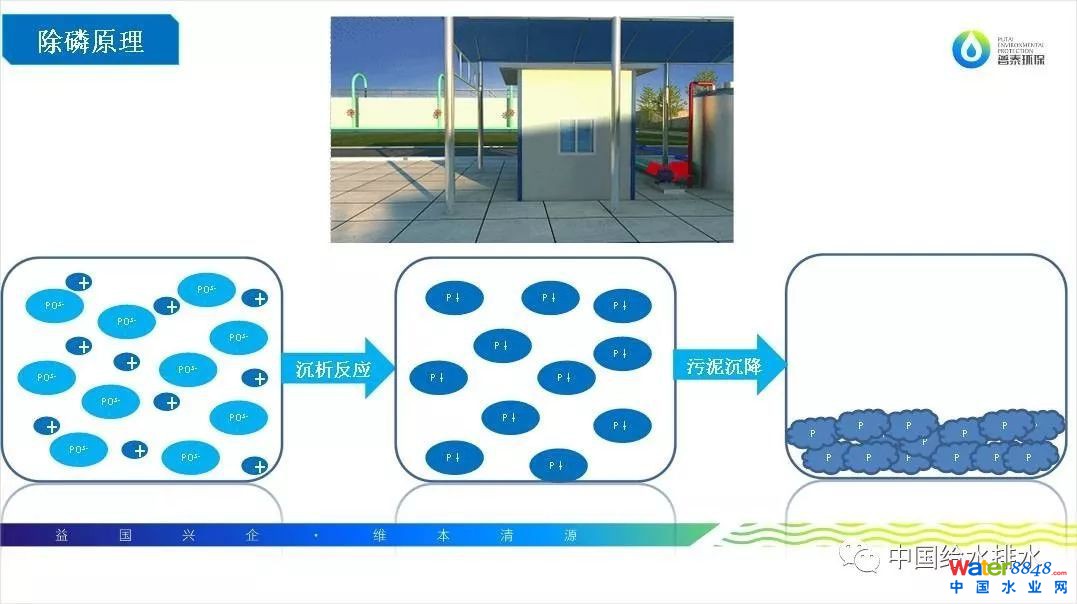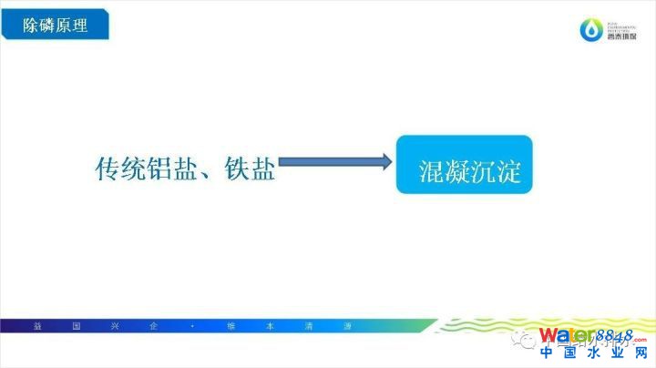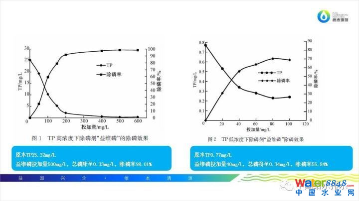 另外講一下除磷原理。目前很多污水處理廠使用的化學(xué)除磷劑都是傳統(tǒng)的鋁鹽和鐵鹽,也就是混凝劑;炷齽┑某自硎腔炷恋恚炷齽┘尤胫了w中首先發(fā)生水解反應(yīng),與水體里面的膠體及沉浮物發(fā)生混凝反應(yīng),生成礬花后沉淀。但我們知道水體里面除了膠體和懸浮物中含有總磷之外,大量的總磷是以溶解狀態(tài)存在的。益維磷的除磷原理是:益維磷加入水中,可以和水體里可溶性總磷發(fā)生反應(yīng),生成不溶性的磷酸鹽顆粒,再通過污泥沉降作用,使不溶性磷酸鹽顆粒隨污泥沉降自然沉降,從而達(dá)到總磷去除效果。