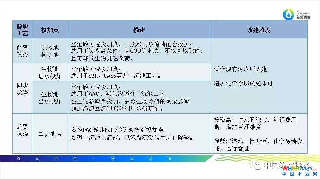 對(duì)前置,同步、后置投加除磷區(qū)別在上表有詳細(xì)描述。對(duì)于前置投加除磷來講,一般建議為偷排污染比較嚴(yán)重的污水處理廠,先進(jìn)行前置除磷,可以把總磷降低到微生物適宜處理范圍。同步除磷是益維磷的主要投加點(diǎn),現(xiàn)在益維磷所運(yùn)用的大部分水廠都使用同步除磷,在生物池就進(jìn)行投加。同步除磷分為生物池進(jìn)水投加和生物池出水投加。生物池進(jìn)水投加適用于沒有二沉池的工藝。有二沉池的工藝一般建議在生物池出水投加。前置和同步除磷不會(huì)過多的增加水廠成本,也就是說水廠不用新建混凝沉淀式或高密沉淀池就可以達(dá)到除磷要求。目前很多的污水廠化學(xué)除磷的投加點(diǎn)都是二沉池之后,在混凝沉淀池發(fā)生混凝反應(yīng)達(dá)到除磷目的。后置除磷會(huì)增加水廠的占地面積,投資成本,還有維護(hù)保養(yǎng)和運(yùn)營(yíng)成本。