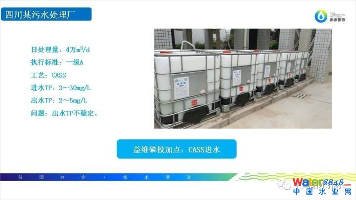 四川地區(qū)CASS工藝污水廠。我們分別取進(jìn)水中磷濃度和進(jìn)水高磷濃度進(jìn)行益維磷實(shí)驗(yàn)。可以看到投加益維磷后的效果,益維磷投加后第三天水質(zhì)就穩(wěn)定達(dá)標(biāo)。