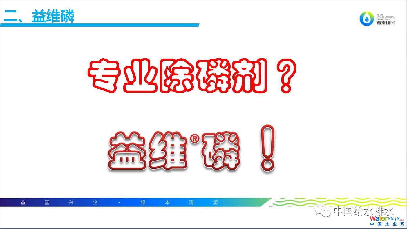 提標(biāo)改造對(duì)于污水廠來說需要做很多的工作。今天早上前面匯報(bào)幾位同仁講過MBBR工藝,這也是部分污水廠提標(biāo)改造需要做的。我之前了解全國(guó)很多污水處理廠都在使用MBBR,效果確實(shí)非常好,增加了水廠的生物脫氮除磷的效率。但對(duì)于提標(biāo)改造來講除磷一直是污水廠的共認(rèn)難題,除了生物除磷外仍需要增加化學(xué)除磷。化學(xué)除磷有沒有一個(gè)專業(yè)的除磷劑,可以滿足水廠不同的水質(zhì),不同的工藝需求呢?答案是“益維磷”。益維磷是發(fā)明專利產(chǎn)品,也是可以將發(fā)明專利轉(zhuǎn)化到污水處理過程當(dāng)中一個(gè)產(chǎn)品。益維磷分為不同的型號(hào),根據(jù)水廠的水質(zhì)、工藝等條件,結(jié)合污水廠遇到的實(shí)際問題,通過實(shí)驗(yàn)室實(shí)驗(yàn)來確定水廠適合哪個(gè)型號(hào)。