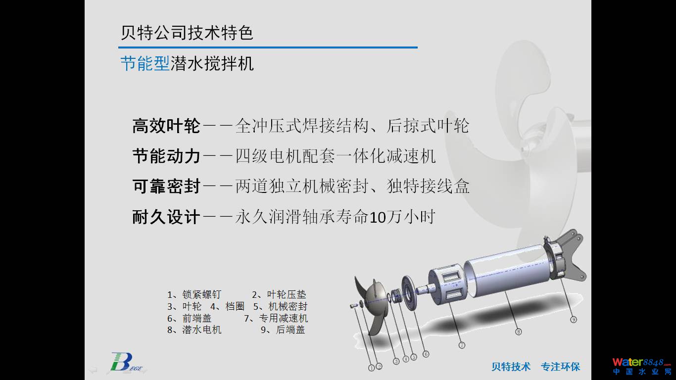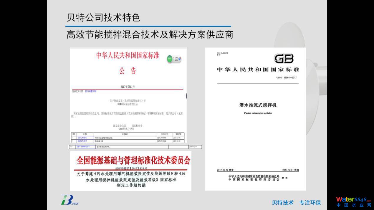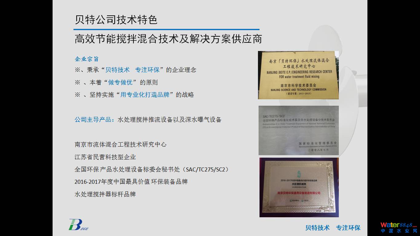 下面我把貝特環(huán)保公司簡要介紹一下,公司正式注冊于2003年6月,多年來一直專注做水處理攪拌類設(shè)備。在這方面我們碰到的問題,做的工程案例,包括經(jīng)驗總結(jié)非常多。公司在攪拌器這個專業(yè)細分領(lǐng)域做了大量的技術(shù)積累工作和設(shè)備的標準化工作。前一段時間8月份在上海水熱點論壇,主辦方給了我們一個榮譽,水處理攪拌器行業(yè)標桿品牌。