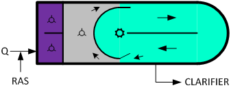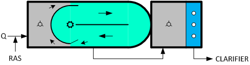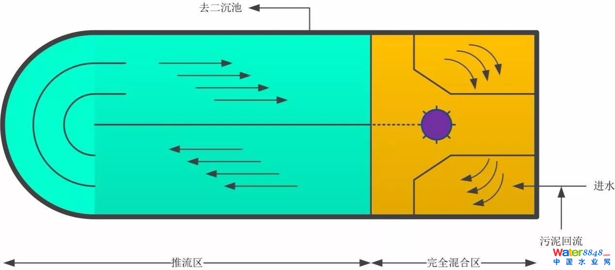如前所述,卡魯塞爾氧化溝最明顯的特征是以立式低速表曝機(jī)取代水平軸表曝機(jī),這樣做的工藝背景是使曝氣區(qū)基本接近完全混合反應(yīng)器的流態(tài),曝氣區(qū)下游的長(zhǎng)渠道則基本接近推流反應(yīng)器模型的流態(tài)。因此卡魯塞爾氧化溝實(shí)際上是將兩種反應(yīng)器模型的優(yōu)勢(shì)結(jié)合在一起,既可利用長(zhǎng)溝道進(jìn)行較為徹底的生化反應(yīng),還能借助完全混合區(qū)的攪拌、緩沖能力化解水質(zhì)負(fù)荷的變化,具有較強(qiáng)的抗沖擊負(fù)荷能力。從現(xiàn)在的工藝觀點(diǎn)來(lái)看,這樣做帶來(lái)的另外一個(gè)好處就是在渠道下游形成的缺氧區(qū)還可以觸發(fā)反硝化反應(yīng)。如下圖所示。