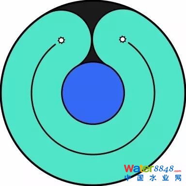 卡魯塞爾氧化溝最明顯的特征是以立式低速表曝機(jī)取代水平軸表曝機(jī),由此使氧化溝的曝氣動(dòng)力效率、機(jī)械設(shè)備可靠性、池深與平面占地、操作環(huán)境、處理效率等方面得到全面的改善和提高。DHV公司卡魯塞爾氧化溝的注冊(cè)商標(biāo)是 Carrousel® ,源自英文單詞Carousel,指兒童游樂(lè)場(chǎng)里的旋轉(zhuǎn)木馬以及飛機(jī)場(chǎng)的行李傳送帶。早期的標(biāo)準(zhǔn)卡魯塞爾氧化溝如下圖所示,圖片來(lái)自原EIMCO公司的產(chǎn)品宣傳資料。