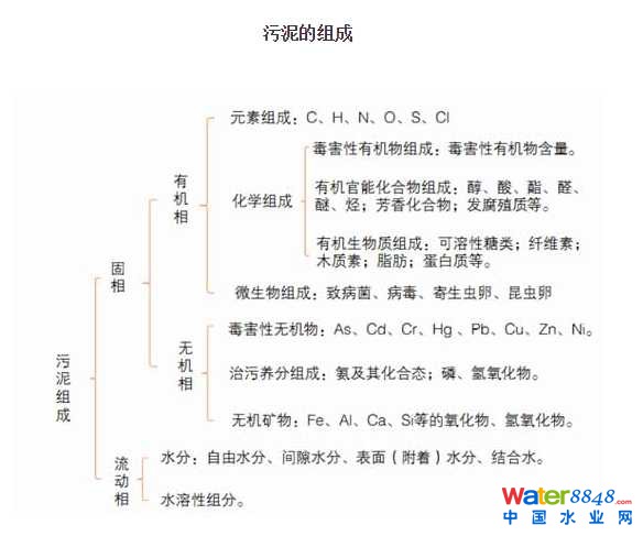目前,我國(guó)大部分污水處理廠處理污水過(guò)程是通過(guò)微生物代謝和物理方法將污水中的污染物轉(zhuǎn)移到污泥中,其實(shí)質(zhì)為將可溶性污染物轉(zhuǎn)變?yōu)椴蝗苄怨腆w存續(xù)在污泥之中,將污染物與水體相分離,因此污泥的成分和性質(zhì)主要取決于污水的成分和性質(zhì)。對(duì)于生活污水而言,物理和化學(xué)性質(zhì)類(lèi)似,處理生活污水所產(chǎn)生污泥的成分和性質(zhì)差別不大。而對(duì)于工業(yè)廢水而言,由于不同行業(yè)、同行業(yè)不同企業(yè)所產(chǎn)生的污水成分差別巨大,在處理這些污水產(chǎn)生的污泥成分也有明顯不同。污泥成分復(fù)雜,但大體上可以將污泥構(gòu)成分為固相和流動(dòng)相,其中固相包括有機(jī)相和無(wú)機(jī)相,流動(dòng)相包括水分和水溶性組分。