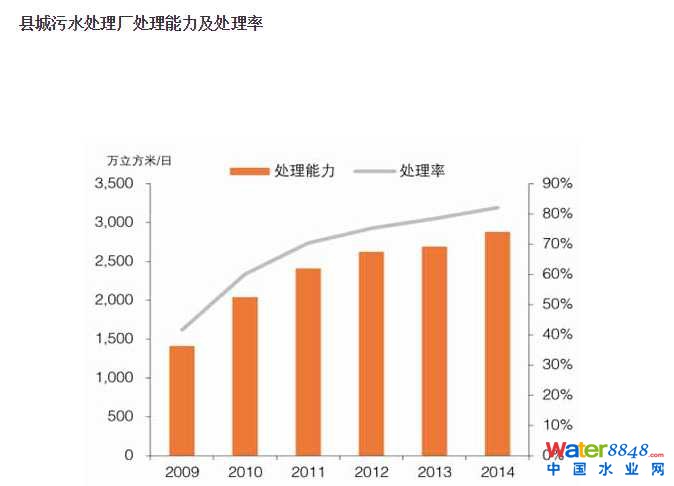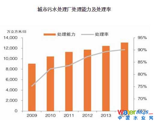 據(jù)住建部統(tǒng)計(jì),2014年年末,全國(guó)城市共有污水處理廠1808座,比上年增加72座,污水廠日處理能力13088萬(wàn)立方米,比上年增長(zhǎng)5.1%,城市年污水處理總量401.7億立方米,城市污水處理率90.18%。2014年年末,全國(guó)縣城共有污水處理廠1554座,比上年增加50座,污水廠日處理能力達(dá)到2881萬(wàn)立方米,比上年增長(zhǎng)7.1%,縣城全年污水處理總量74.3億立方米,污水處理率為82.11%。總體來(lái)說(shuō)城鎮(zhèn)污水處理已經(jīng)達(dá)到相當(dāng)高的水平。