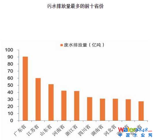 隨著我國(guó)經(jīng)濟(jì)快速發(fā)展,我國(guó)污水排放量也持續(xù)增加,2014年,我國(guó)污水排放總量達(dá)716.2億噸,同比增長(zhǎng)2.99%。其中,工業(yè)廢水排放量205.3億噸,城鎮(zhèn)生活污水排放量510.3億噸。2014年,我國(guó)污水排放量前十省份分別為廣東省、江蘇省、山東省、河南省、浙江省、四川省、湖南省、河北省、湖北省、安徽省,共排放廢水438.7億噸,占全國(guó)廢水排放量的61.25%。