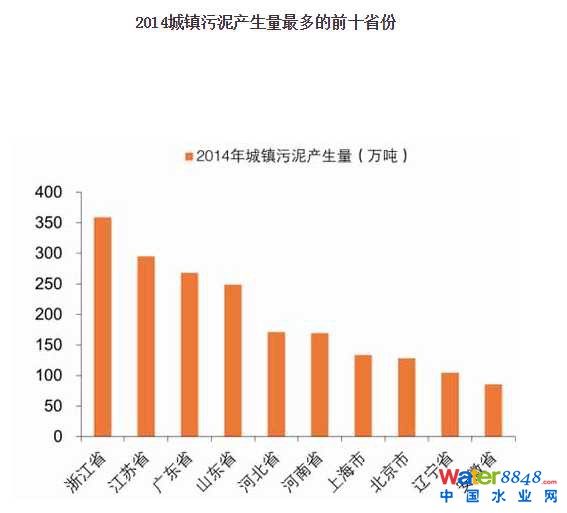 污泥作為污水處理的副產(chǎn)品,其產(chǎn)生量也不斷增加。根據(jù)環(huán)保部的統(tǒng)計(jì),2014年我國(guó)城鎮(zhèn)污泥產(chǎn)生量為2801.47萬(wàn)噸,同比增長(zhǎng)11.57%,2008~2014年均增長(zhǎng)11.57%。2014年,污泥產(chǎn)生量最多的前十省仹分別為浙江省、江蘇省、廣東省、山東省、河北省、河南省、上海市、北京市、遼寧省、安徽省,共產(chǎn)生污泥1964.44萬(wàn)噸,占比70.12%。城鎮(zhèn)污泥產(chǎn)生量最多的三個(gè)省仹為浙江、江蘇、廣東,其污泥產(chǎn)生量分別為359.06萬(wàn)噸、295.29 萬(wàn)噸、268.29萬(wàn)噸。長(zhǎng)期以來(lái),我國(guó)污水處理廠普遍存在“重水輕泥”的現(xiàn)象,使得我國(guó)污水處理快速發(fā)展,污泥處理停滯不前,污泥處理處置缺口巨大。