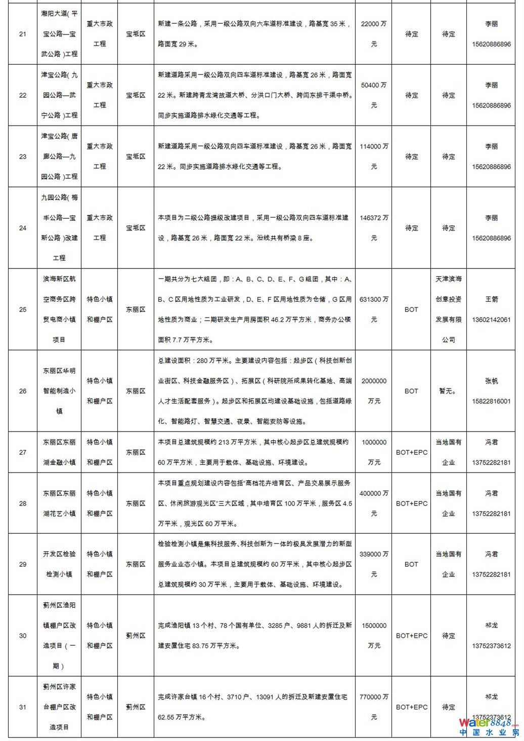 在此次公布的項目中,包括津石高速公路天津西段項目,該項目東起天津濱海新區(qū)南港,向西途經(jīng)濱海新區(qū)、靜海、河北省廊坊(大城)、保定(任丘、高陽)、石家莊(安國、市區(qū)),與石家莊繞城高速公路銜接,路線全長約295公里,項目靜態(tài)總投資約28.89億元,整體建設(shè)工期約為36個月,與河北省段津石高速公路同步通車;地鐵8號線一期工程項目,沿線設(shè)站25座,均為地下站,一期工程建設(shè)年限為2017-2022年,計劃于2022年建成通車;濱海新區(qū)軌道交通Z2線一期項目,長度約38.8公里,其中地下敷設(shè)7.53公里,高架敷設(shè)31.27公里,車站12座;解放南路地區(qū)海綿城市建設(shè)項目,將對該片區(qū)的排水系統(tǒng)進行改造,新建泵站進行初期雨水治理,按規(guī)劃建設(shè)中央綠軸和衛(wèi)津河公園,對老排水片區(qū)進行海綿系統(tǒng)排水改造,配套建設(shè)道路13條。大沽河凈水廠一期工程項目,建設(shè)凈化河道水體的凈水廠一座,一期工程規(guī)模20萬噸/日,擬采取人工快滲工藝,配合中心城區(qū)景觀河道綜合整治工程,該凈水廠負責對中心城區(qū)海河及二級河道的循環(huán)水體進行凈化處理的運營,出水水質(zhì)要達到地表四類水。