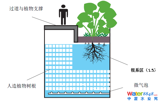 與其他基于活性污泥法的方案相比,使用自然(植物)和人工(專(zhuān)利的生物纖維)根須結(jié)構(gòu)作為生物膜載體,能夠在每立方米的反應(yīng)器體積內(nèi)培養(yǎng)和維持三至四倍于活性污泥法的生物濃度。在系統(tǒng)中,反應(yīng)器中的生物大部分是附著生長(zhǎng)而不是懸浮的。因此需使用“等效生物濃度”(EBC)而不采用混合液懸浮固體濃度(MLSS)來(lái)描述生物質(zhì)濃度。系統(tǒng)的等效生物濃度換算下來(lái)高達(dá)15~18kg/m3。相比之下,遠(yuǎn)高于一般活性污泥法的混合液懸浮固體濃3~5kg/m3。與典型的生物接觸氧化法相比,食物鏈反應(yīng)器中的生物數(shù)量更多表面積更大,其表面積與體積比高達(dá)12000m2/m3,使得反應(yīng)器體積內(nèi)的活性污泥高達(dá)15~18kg/m3。結(jié)果是其所需的水力停留時(shí)間(HRT)比典型的生物接觸氧化更短。與活性污泥法相比,食物鏈反應(yīng)器,在移除相同量的污染物/營(yíng)養(yǎng)物質(zhì)所需的反應(yīng)器體積是活性污泥法的一半(或更小),節(jié)約用地效果明顯。FCR食物鏈反應(yīng)器植物與填料結(jié)合示意圖見(jiàn)下圖。