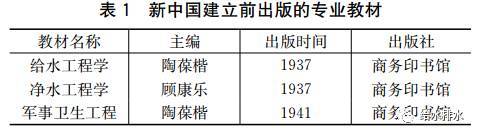 新中國建立前出版了少量的衛(wèi)生工程學科的專業(yè)教材(見表1)。在1952年專業(yè)建立之前及專業(yè)創(chuàng)辦初期,有一些相關(guān)專業(yè)或從蘇聯(lián)教材翻譯的其他專業(yè)教材(見表2)。