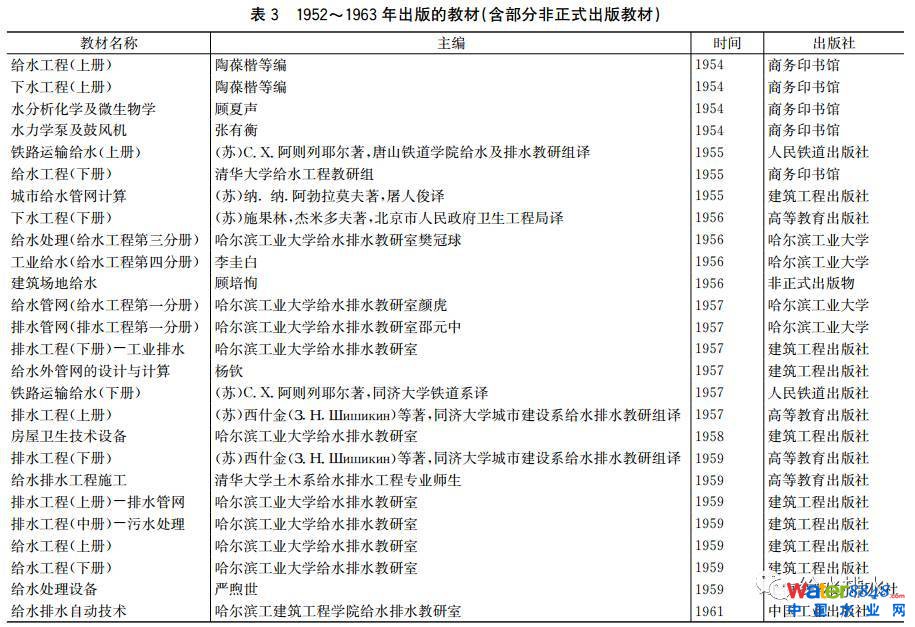 1952年后,為了解決給排水專業(yè)教材急需的問題,一些高校和政府主管部門組織翻譯出版了一批蘇聯(lián)教材,同時也編著出版了一批教材,為給排水專業(yè)的教學提供了基礎(chǔ)(見表3)。