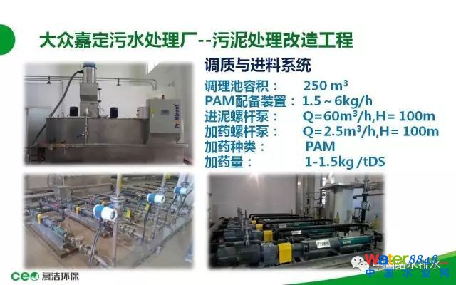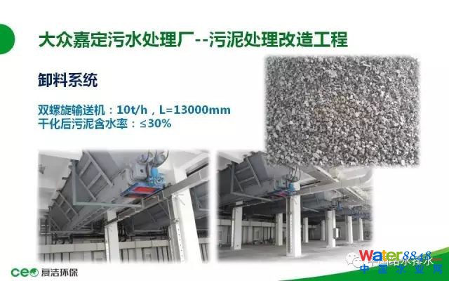 下面我介紹一個近期的工程案例。大眾嘉定污水處理廠:這是上海大眾嘉定BOT運(yùn)行的污水處理廠,污水廠的設(shè)計污水處理規(guī)模是17.5萬噸,分三期建設(shè),現(xiàn)在三期已經(jīng)建設(shè)完成了。近期的污泥處理規(guī)模是150噸,就是17.5萬噸的水,150噸的泥,污泥干化設(shè)備的供貨安裝,這是一個標(biāo)段,采用低溫真空脫水干化工藝,原泥96-98%一次性脫水干化至含水率30%以下,處理以后的污泥總量理論計算是42.8噸,減量71%左右。