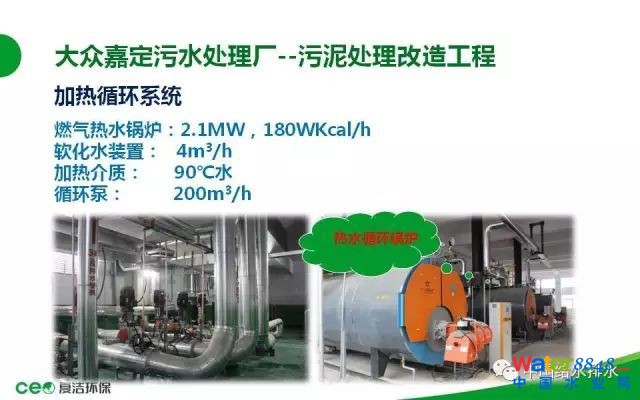 這個流程圖是典型的工藝流程圖。左側(cè)是污泥板塊,那么左上節(jié)是一個污泥濃縮設(shè)備,F(xiàn)在污水處理廠大多數(shù)都有重力氣濃縮,沒有重力濃縮的話,加一個設(shè)備,達(dá)到污泥預(yù)濃縮。右側(cè)我們在傳統(tǒng)的工藝上增加了一個熱源系統(tǒng),工藝圖中寫的是蒸汽,在項目過程中,所需要的熱源是80-90度的熱水,如果項目中有蒸汽,由蒸汽加熱熱水;如果沒有蒸汽,我們是配一些比如說電鍋爐、天然氣鍋爐,包括利用余熱蒸汽,兩三公斤低品位蒸汽,在這個過程中也可以使用。
