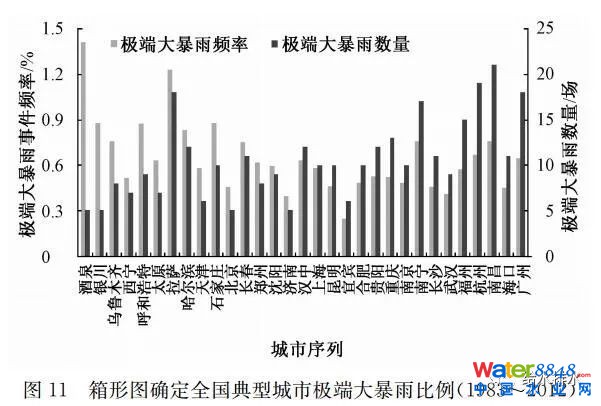 采用箱形圖確定極端大暴雨事件的分析過程為①統(tǒng)計(jì)數(shù)據(jù)范圍:本次統(tǒng)計(jì)針對(duì)高重現(xiàn)期降雨,因此統(tǒng)計(jì)數(shù)據(jù)范圍確定為城市高于85%雨水年徑流總量控制率對(duì)應(yīng)設(shè)計(jì)降雨量值的降雨數(shù)據(jù)。②計(jì)算第一四分位數(shù)Q1、第三四分位數(shù)Q3及IQR。③將大于(Q3+1.5IQR)的降雨數(shù)據(jù)作該城市的極端大暴雨事件,并統(tǒng)計(jì)其個(gè)數(shù)及頻率(極端大暴雨場次占降雨總場次數(shù)的比例)。統(tǒng)計(jì)全國31個(gè)城市極端大暴雨頻率結(jié)果如圖11所示。