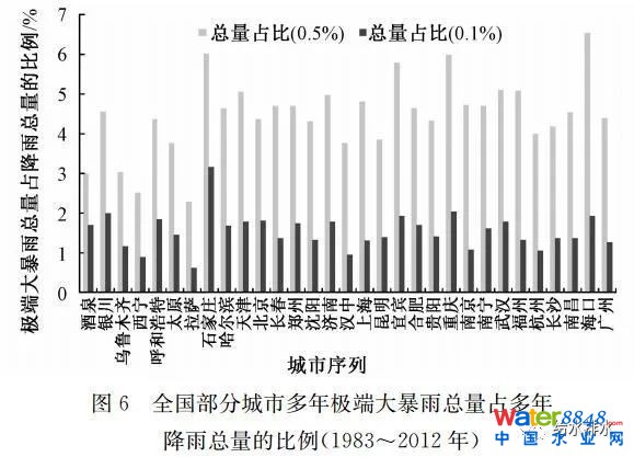 極端大暴雨事件的場次數(shù)少卻貢獻(xiàn)了較高的徑流總量,圖5、圖6分別統(tǒng)計(jì)了全國31個(gè)城市的多年(1983~2012年)累計(jì)的極端大暴雨總數(shù)與總量占比(極端大暴雨總量占多年降雨總量的比例)。統(tǒng)計(jì)結(jié)果表明,當(dāng)以末端頻率小于0.5%的降雨事件作為極端暴雨事件,31個(gè)城市30年累計(jì)的極端大暴雨總數(shù)平均為8.8場,總量占比平均為4.5%,其中最高為6.5%(海口),最低為2.3%(拉薩);當(dāng)以末端頻率小于0.1%的降雨事件作為極端暴雨事件,31城市30年累計(jì)的極端大暴雨總數(shù)平均為1.8場,總量占比平均為1.5%,其中最高為3.1%(石家莊),最低為0.6%(拉薩)。