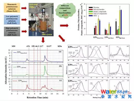 該論文系統(tǒng)考察了污水中單體態(tài)、低聚合態(tài)和高聚合態(tài)底物對(duì)活性污泥系統(tǒng)中胞外聚合物(EPS)化學(xué)組分和官能團(tuán)組成的影響特征。研究結(jié)果顯示,底物聚合程度的提高顯著改變了EPS的化學(xué)成分和官能團(tuán)組成,使蛋白質(zhì)相關(guān)官能團(tuán)的比例(如:–CO–NH–,C=O,N–C,N–H)顯著增加,而多糖相關(guān)官能團(tuán)的比例(如:C–O–C,C–O–H,O=C–OH)顯著降低。此外,EPS中腐殖酸類物質(zhì)的比例增加近6~16倍之多,表明了EPS中腐殖酸類物質(zhì)與底物水解過(guò)程的相關(guān)關(guān)系;瘜W(xué)組分和官能團(tuán)組成的改變,也導(dǎo)致EPS的物理化學(xué)特性發(fā)生了顯著的變化。由于EPS的物理化學(xué)特性與活性污泥的結(jié)構(gòu)和性質(zhì)有著密切的聯(lián)系,也對(duì)當(dāng)前剩余污泥處理問(wèn)題以及膜生物反應(yīng)器中膜污染問(wèn)題有重要影響,論文對(duì)理解污水中聚合態(tài)底物如何影響污泥特性以及后續(xù)的污泥處理和膜污染問(wèn)題具有重要意義。