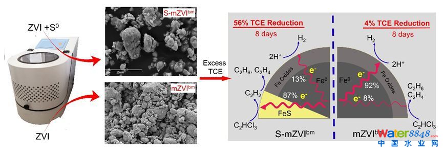 該研究首次報(bào)道了使用機(jī)械化學(xué)方法合成硫化微米零價(jià)鐵(S-mZVI),克服了現(xiàn)有液相化學(xué)方法硫化納米零價(jià)鐵存在的諸多技術(shù)缺陷,為硫化零價(jià)鐵的規(guī);珊蛻(yīng)用提供了新的技術(shù)途徑。該研究還提出了一種電子利用效率的準(zhǔn)確計(jì)算方法,系統(tǒng)評(píng)價(jià)了S-mZVI降解三氯乙烯的反應(yīng)途徑、動(dòng)力學(xué)、電子效率以及降解容量,并與美國(guó)Oregon Health & Science University合作使用電化學(xué)手段探究了S-mZVI降解三氯乙烯的增效機(jī)制,為硫化零價(jià)鐵的研究提供了多種借鑒手段。