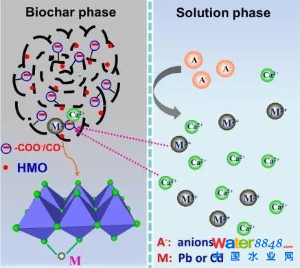 該研究將水合氧化錳(HMO)納米顆粒浸漬在花生殼燒制的生物炭(BC)中,得到性能優(yōu)良的納米復(fù)合吸附劑HMO-BC。HMO-BC可以在較寬泛的pH值范圍內(nèi)(3~7)可有效絡(luò)合Pb()及Cd(),且HMO-BC在存在強(qiáng)競(jìng)爭(zhēng)陽(yáng)離子的情況下吸附能力比純BC更優(yōu)。復(fù)合吸附劑中BC的存在顯著降低了在酸性pH條件下Mn的浸出。嵌入式的HMO納米顆粒有利于目標(biāo)陽(yáng)離子的內(nèi)球絡(luò)合,正如XPS光譜所示,與BC結(jié)合的非擴(kuò)散性的帶負(fù)電的含氧基團(tuán)通過(guò)Donnan膜效應(yīng)使Pb()及Cd()預(yù)先富集和滲透到孔道中,實(shí)現(xiàn)重金屬陽(yáng)離子的優(yōu)先吸附。本實(shí)驗(yàn)克服了單獨(dú)應(yīng)用HMO或BC處理含重金屬?gòu)U水的技術(shù)障礙。