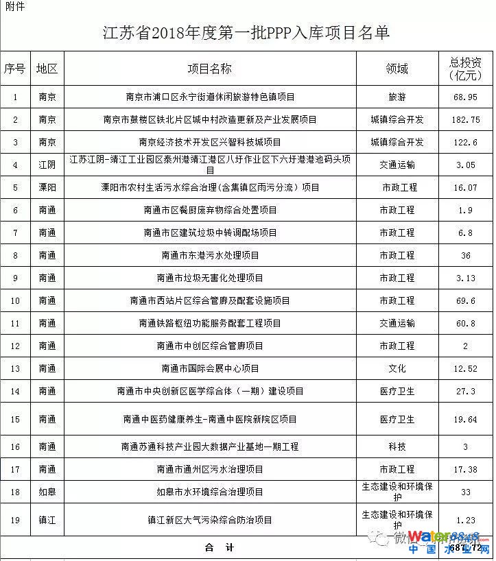 江蘇省財(cái)政廳關(guān)于2018年度第一批政府和社會(huì)資本合作(PPP)項(xiàng)目入庫(kù)的通知 確定了19個(gè)項(xiàng)目,總投資687.72億元作為江蘇省2018年度第一批PPP入庫(kù)項(xiàng)目(名單見(jiàn)附件) 污水處理 ,水環(huán)境 等