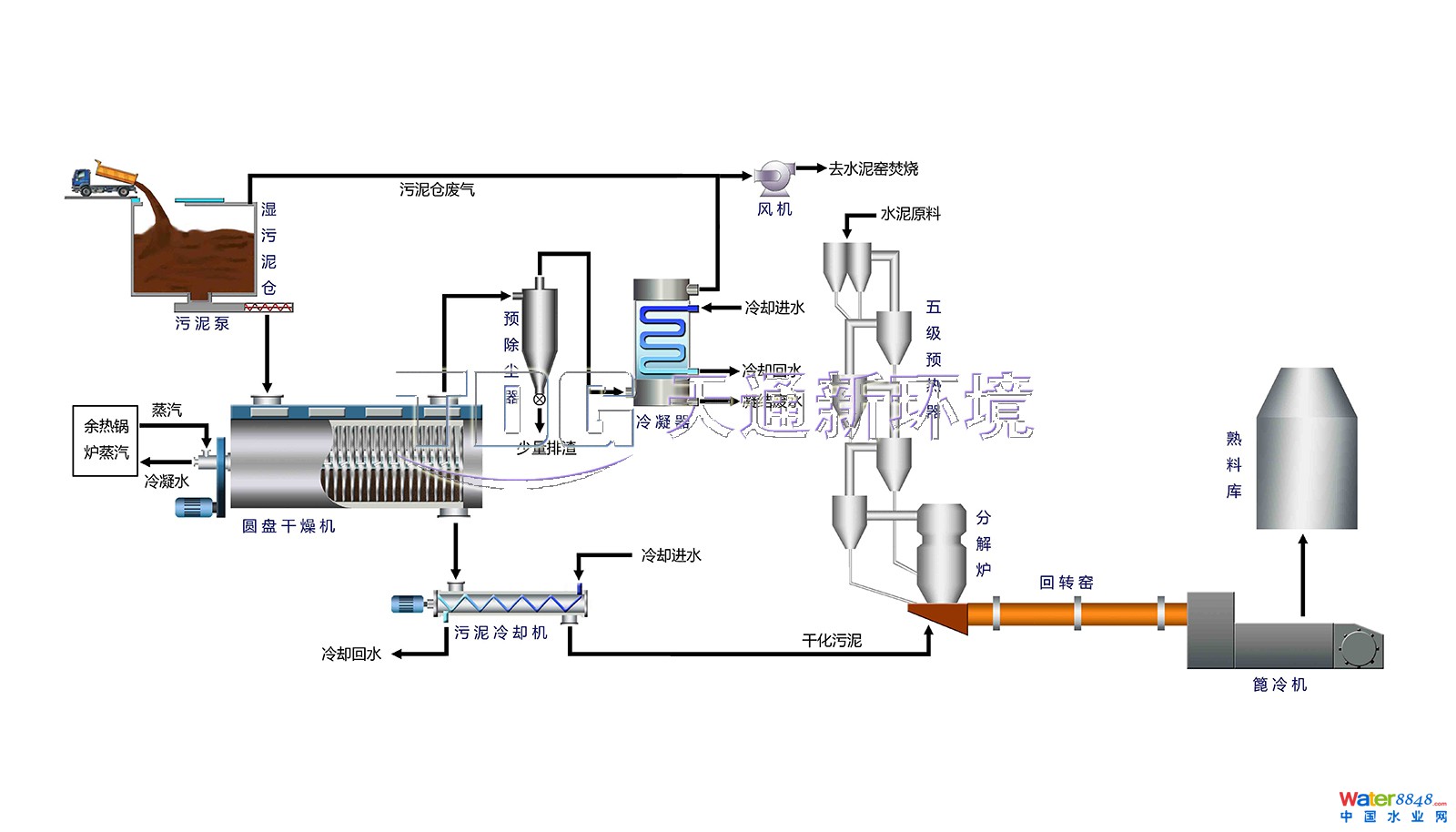 濕污泥由污泥車(chē)運(yùn)至濕污泥倉(cāng),然后被泵送至干燥機(jī)內(nèi),利用AQC爐或SP爐或背壓汽輪機(jī)做功后的乏汽,作為干化熱源,濕污泥定量進(jìn)入干燥機(jī)后,通過(guò)圓盤(pán)的緩慢轉(zhuǎn)動(dòng)使污泥翻轉(zhuǎn)、攪拌,不斷更新加熱界面,充分與被加熱的機(jī)身和圓盤(pán)接觸、換熱,使污泥所含的表面水分蒸發(fā)。同時(shí),污泥隨導(dǎo)向機(jī)構(gòu)推向出料口方向輸送,在輸送中繼續(xù)攪拌,使污泥被干化。干污泥由出料口排出,作為輔助燃料被輸送至水泥回轉(zhuǎn)窯內(nèi)焚燒處置。蒸氣與濕污泥換熱后冷凝,由熱水循環(huán)泵回流至鍋爐系統(tǒng)內(nèi)循環(huán)利用,污泥干化過(guò)程中成生一定量的尾氣,其主要成分為水蒸汽,經(jīng)過(guò)冷凝除濕后的尾氣引至水泥回轉(zhuǎn)窯焚燒除臭。