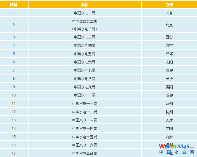 2)中水顧問(HYDROCHINA),中國水電工程顧問集團(tuán)有限公司,前身為水利水電規(guī)劃設(shè)計(jì)總局(院),主要分為中國水電顧問集團(tuán)國際工程有限公司和中國水電顧問集團(tuán)投資有限公司,2002年12月改組為中國水利水電建設(shè)集團(tuán)公司,2011年成為中國電建全資子公司。總部北京。