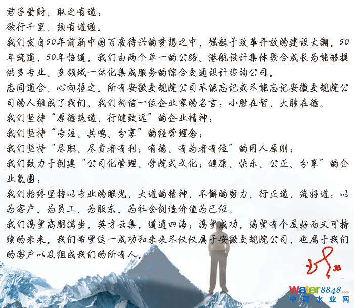 企業(yè)使命是企業(yè)存在的意義和價(jià)值,是企業(yè)肩負(fù)的最大責(zé)任,是企業(yè)存在的根本目的。"創(chuàng)作精品工程、設(shè)計(jì)現(xiàn)代交通"體現(xiàn)了交規(guī)院以客戶企業(yè)、員工、社會(huì)、環(huán)境的發(fā)展為己任,持續(xù)進(jìn)步,健康發(fā)展,和諧共生的歷史使命