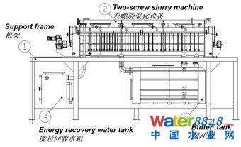 公司開發(fā)了預(yù)熱漿化成套設(shè)備專利設(shè)備,由機(jī)架、雙螺旋漿化設(shè)備、能量回收水箱和緩沖倉四大部分組成,如下圖: