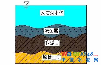 A河道及兩條支流全長81.6km,自1965年改造至今,40余年來一直是某城市南部區(qū)域主要工業(yè)廢水、生活污水及污水處理廠尾水的排放通道。目前,該河道斷面逐年減小,河底淤泥深達(dá)1-2m,沿河構(gòu)筑物損壞嚴(yán)重且規(guī)模不足。對(duì)該河道水流及底泥進(jìn)行調(diào)查,水質(zhì)氨氮達(dá)125mg/Kg,生化需氧量246mg/Kg,流泥層含水率50%-100%,軟泥層含水率38%-50%,原狀土層含水率33%,污染嚴(yán)重。