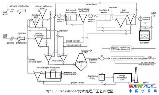 Gut Grosslappen污水廠的污泥處理包含了Gut Marienhof污水廠的污泥,泥量各占50%。沼氣發(fā)電量可以提供全廠50%的用電量。處理工藝為:濃縮→厭氧消化→焚燒(蒸汽干化到含固率45%,然后800℃焚燒),沼氣經(jīng)過(guò)提純后用于熱電聯(lián)產(chǎn)。