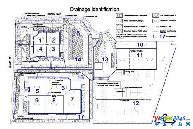 校園的三個(gè)區(qū)域根據(jù)地面特性被分為17個(gè)排水區(qū)域(圖二)。各種處理單位(統(tǒng)稱為best management practice,BMP),都被運(yùn)用到了項(xiàng)目設(shè)計(jì)中。其中包括了三種滲水鋪面、生物滯留池、地下儲(chǔ)水池、生態(tài)溝、過濾綠化植被容器以及模塊化濕地等。設(shè)計(jì)徑流路線的過程中,設(shè)計(jì)者也考慮到盡可能使水流經(jīng)更多的BMP。