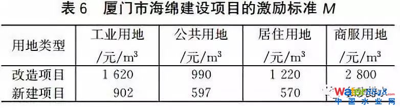 根據(jù)式(2),結(jié)合已確定的單位容積成本P及激勵(lì)系數(shù)α,確定廈門市海綿城市建設(shè)激勵(lì)標(biāo)準(zhǔn)M。其中改造的商服用地的激勵(lì)標(biāo)準(zhǔn)最高,為2 800元/m3,其原因在于受商服用地的海綿城市改造條件的限制,其建設(shè)的單位容積成本高,具體如表6。