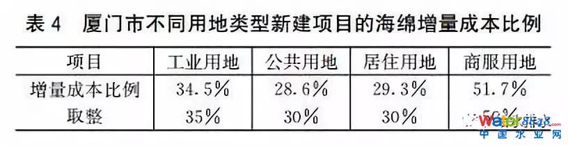 通過分析廈門市4種用地類型的新建典型項(xiàng)目的造價(jià),確定新建項(xiàng)目的海綿城市建設(shè)增量成本比例,結(jié)果表明,不同用地類型海綿建設(shè)增量成本各不相同,其中商業(yè)用地增量比例最高,約51.7%,其余為30%左右。具體增量成本比例如表4所示。