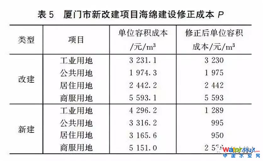 結(jié)合新建項(xiàng)目海綿建設(shè)成本的修正系數(shù),不同建設(shè)工況、不同用地類型的激勵(lì)成本確定見表5。