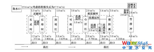 引水干渠的路由不僅對(duì)沿途河道有良好的輻射補(bǔ)水效應(yīng),也極大地縮短了城市各水廠取水口上移后原水至城市主要水廠之間新建管道的長(zhǎng)度,避免反復(fù)征地拆遷、減少對(duì)社會(huì)不利影響,以最少的時(shí)間成本和經(jīng)濟(jì)成本發(fā)揮干渠多重價(jià)值,為未來地區(qū)的發(fā)展帶來巨大的社會(huì)和經(jīng)濟(jì)效益。因此,在系統(tǒng)方案設(shè)計(jì)中重點(diǎn)研究?jī)?nèi)河補(bǔ)水和城市原水多功能的集合利用可行性,經(jīng)過多輪方案的比選,系統(tǒng)方案布置如圖4。