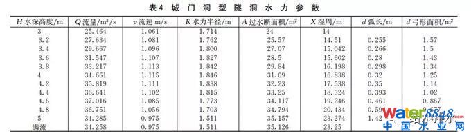 計(jì)算過程中對(duì)于斷面不規(guī)則的隧洞部分,首先進(jìn)行了不同流量下的標(biāo)準(zhǔn)水深計(jì)算,設(shè)計(jì)采用粗糙度n=0.013 5,i=0.1‰進(jìn)行計(jì)算,對(duì)于頂部不規(guī)則部分進(jìn)行水力半徑計(jì)算,計(jì)算表如表4,分別得出對(duì)應(yīng)的流量和流速,用于疊加工況水力計(jì)算。