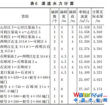 計(jì)算時(shí)由干渠末端水量和斷面尺寸倒推上游水位,對(duì)于矩形與城門洞型隧洞漸變段考慮水頭損失和因流態(tài)變化產(chǎn)生的水躍或雍水造成水位變化。推算到渠道首部城門洞型時(shí)采用插值法確定水深,經(jīng)校核水深誤差在1%以內(nèi)。計(jì)算表結(jié)果如表6所示。