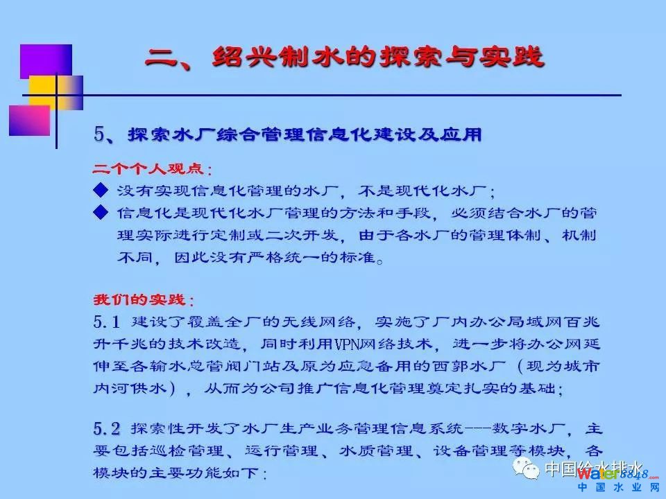 紹興市制水有限公司由宋六陵水廠、曹娥江水廠、平水江水廠組成,是面向紹興市越城區(qū)、柯橋區(qū)的供水企業(yè),服務(wù)面積1100平方公里,服務(wù)人口近200萬,其中宋六陵水廠是浙江省單體規(guī)模最大水廠、浙江省首家現(xiàn)代化水廠,該廠建設(shè)了覆蓋全廠的無線網(wǎng)絡(luò),實施了廠內(nèi)辦公局域網(wǎng)百兆升千兆的技術(shù)改造,同時利用VPN網(wǎng)絡(luò)技術(shù),進(jìn)一步將辦公網(wǎng)延伸至各輸水總管閥門站及原為應(yīng)急備用的西郭水廠(現(xiàn)為城市內(nèi)河供水),從而為公司推廣信息化管理奠定扎實的基礎(chǔ);探索性開發(fā)了水廠生產(chǎn)業(yè)務(wù)管理信息系統(tǒng)——數(shù)字水廠,主要包括巡檢管理、運行管理、水質(zhì)管理、設(shè)備管理等模塊;建立了公司綜合管理信息平臺,該平臺已集成了集團(tuán)開發(fā)的自動化辦公(OA)系統(tǒng)、數(shù)字水廠系統(tǒng),自主開發(fā)了教育管理系統(tǒng),目前正在開發(fā)信息中心、數(shù)據(jù)處理中心二個子系統(tǒng),下一步將進(jìn)一步集成綜合安防管理系統(tǒng)、二維碼資產(chǎn)管理系統(tǒng),真正實現(xiàn)水廠管理信息的高度集成與共享;借G20東風(fēng),投資60余萬元對水廠自控系統(tǒng)的信息安全進(jìn)行升級改造,達(dá)到了《信息安全技術(shù)信息系統(tǒng)安全等級保護(hù)基本要求》[GB/T22239-2008]標(biāo)準(zhǔn)中的三級標(biāo)準(zhǔn);投資100余萬元,完善了全廠建筑物及電子信息系統(tǒng)的防雷設(shè)施及全廠等電位接地系統(tǒng);在門衛(wèi)值班室安裝訪客機(jī)、指紋考勤機(jī),對來人來訪人員及職工上下班進(jìn)行信息化管理;2018年即將實施的項目還有輸水總管GIS系統(tǒng)(含巡檢管理)、生產(chǎn)自控系統(tǒng)升級改造(上、下位機(jī)軟件及部分服務(wù)器升級)。