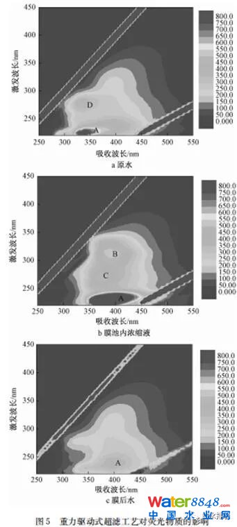 采用三維熒光光譜方法可以高效監(jiān)測水中不同類型的熒光有機物的遷移轉化規(guī)律。如圖5所示,通過定性分析,可以發(fā)現,膜池中蛋白類有機物質含量有所增長,這是由蛋白類物質相對分子質量較高,被超濾截留后在膜池內累積造成的。另一方面,超濾膜膜后水的蛋白類和腐殖質類物質的濃度均大幅下降,只是在腐殖酸區(qū)域出現微弱的峰。這說明重力驅動式超濾工藝對于去除原水中有機物有較好的效果,可以有效保障出水水質。