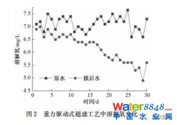 重力驅動式超濾工藝試驗共運行30 d,試驗期間并沒有采取水力反洗、化學清洗、膜池排泥等緩解膜污染的措施。圖2所示為原水和膜后水中溶解氧的含量。由此可知原水溶解氧在6.6~7.7 mg/L。