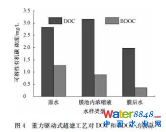低壓重力驅動式超濾工藝作為一種新的超濾工藝運行方式,利用表面濾餅層中生物作用可以用以簡化超濾運行設備,降低物理和化學清洗產生的費用。另一方面,重力驅動式超濾工藝長期穩(wěn)定的運行說明針對引黃水庫水這一北方特殊水質,低壓重力驅動式超濾工藝具有很好的處理效果。