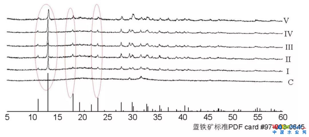 XRD衍射結果表明,C組圖譜在5°~60°范圍內未出現(xiàn)任何晶體特征峰,表明未加鐵的空白組經(jīng)厭氧消化后并沒有任何晶體生成。添加FeOOH的各組污泥在11.16°、13.19°等角度均出現(xiàn)了相同的特征峰,表明污泥中生成了同一類型的晶體物質。經(jīng)與PDF圖庫(JCPDS)比對發(fā)現(xiàn),污泥特征峰與藍鐵礦PDF標準圖譜#97-003-0645比較吻合,初步顯示污泥中出現(xiàn)了藍鐵礦晶體。此外,X射線圖譜中并未出現(xiàn)藍鐵礦晶體以外的特征峰值,這說明藍鐵礦晶體為污泥(粉末)中唯一晶相