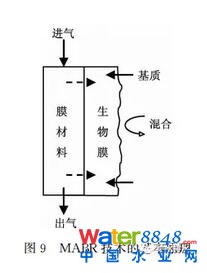 近些年來(lái),在曝氣利用效率方面一項(xiàng)頗具發(fā)展?jié)摿Φ纳锬ぜ夹g(shù)是MABR(Membrane Aerated Biofilm Reactor,即膜曝氣生物膜反應(yīng)器)引起業(yè)內(nèi)的廣為關(guān)注,并被眾多研究者廣為看好。MABR的主要原理是采用空氣在膜絲中進(jìn)入,生物膜附著于膜材料表面上(如圖9所示),曝氣的氧利用效率得到了極大的提高。傳統(tǒng)微孔曝氣技術(shù)的氧轉(zhuǎn)移率通常為1~2 kg O2/k˙Wh,而MABR可以達(dá)到6 kg O2/kW˙h以上,節(jié)能效果非常顯著。