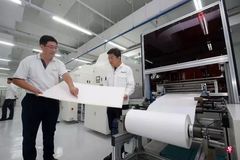 “我們的方法是在原材料中加入一些助劑,把它變成可以打印的材料。運(yùn)用新技術(shù)打印出納米纖維膜,然后通過自動(dòng)化生產(chǎn)線做出膜板。這個(gè)方法不會(huì)帶來有毒污水,也大幅減少?gòu)U氣。