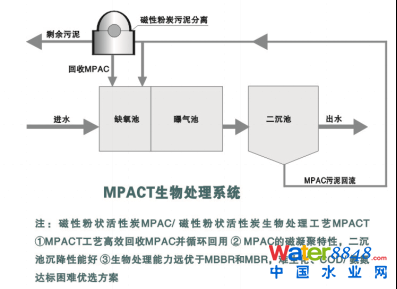 為解決活性炭排泥流失,投加帶有磁性的粉狀活性炭,在排出剩余污泥時(shí)先經(jīng)過磁性粉炭污泥分離器將帶磁的粉末活性炭回收并回到原生化系統(tǒng)循環(huán)使用,這就是在杜邦PACT法基礎(chǔ)上再創(chuàng)新開發(fā)并享有專利的MPACT磁性粉末活性炭生物處理工藝。